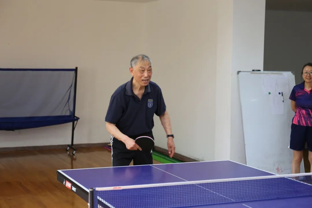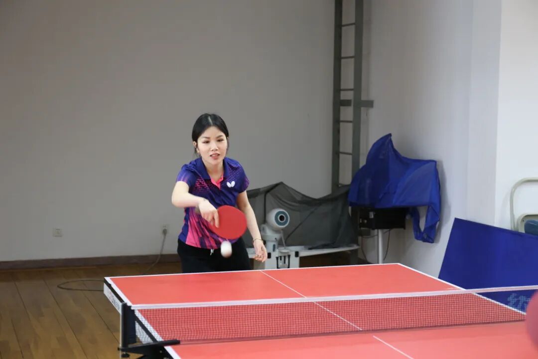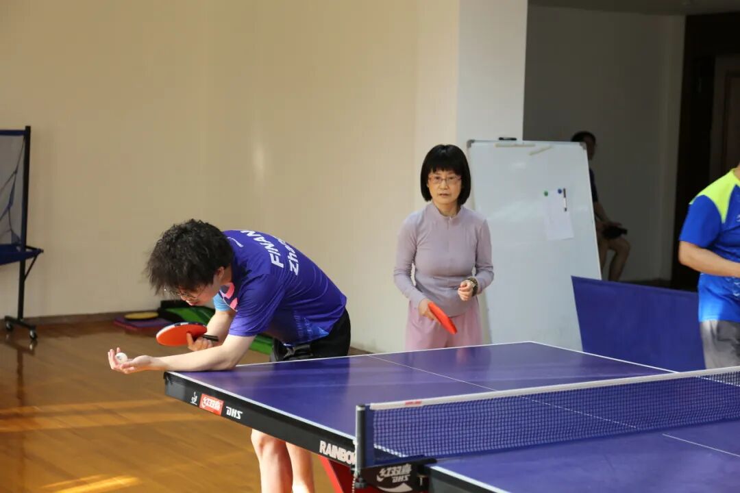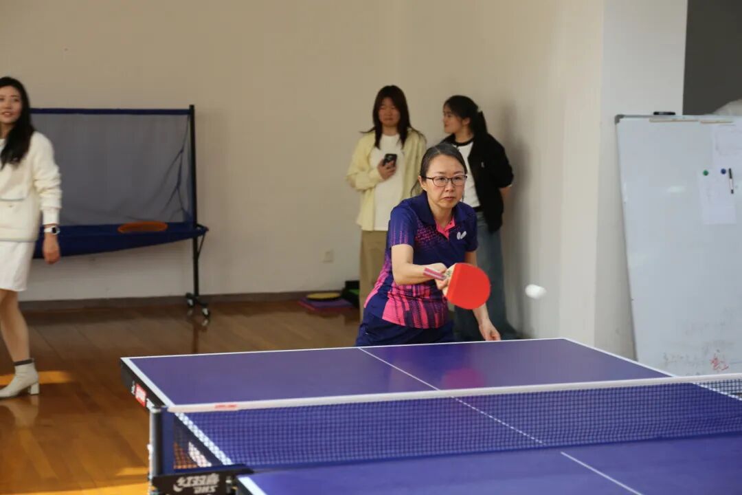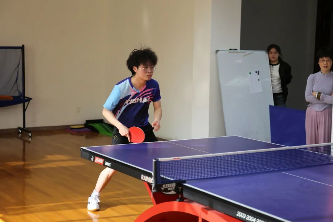 在教师女单环节,王绚、易雯、周芳三位老师展现了女老师们的巾帼风采。两场比赛节奏平稳、技巧精湛,比分呈现出稳步推进的态势。第一场,易雯老师凭借细腻的战术和精准的回球,始终保持比分领先,从4:1一路领先至10:4,最终以2:0获胜;第二场,周芳和王绚两位老师对决,双方技巧相当,注重落点控制和节奏把控,比分缓慢上升,最终王绚老师凭借更巧妙的搓球技巧,以大比分2:0拿下比赛。