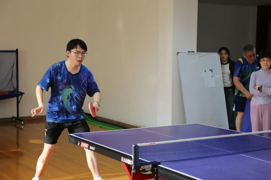 在学生女单环节,袁一苇、李沩玮、孙博文、顾欣妍四位同学用实力展现青春风采,三场比赛各有特色,既有稳健发挥,也有逆转惊喜。第一场顾欣妍对战袁一苇,后者沉着冷静,凭借稳定的实力占据上风,最终以大比分2:1获胜。第二场顾欣妍对阵孙博文,双方比分胶着,前两场比赛分不出高下,最终孙博文凭借一记巧妙的放小球,以11:9险胜。第三场,李沩玮同学展现出极强的实力,凭借快速的对冲和细腻的搓球很快以2:0大比分取得胜利。