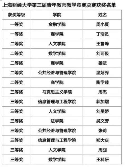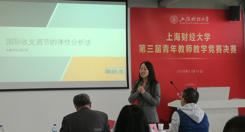 在2019年5月30日-6月4日举办的上海财经大学第三届青年教师教学竞赛初赛中,金融学院的周小夏老师就表现突出,获得经济学科组第一名的好成绩;2019年11月15日举办的学青教赛决赛中,周小夏老师再次凭着出色的发挥,获得决赛第一名的好成绩,这是继2015年我院的李彥德老师获得第一届青教赛第一名后又一个重大成果。