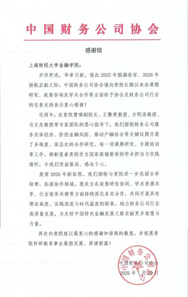上海财经大学金融学院获中国财务公司协会感谢信